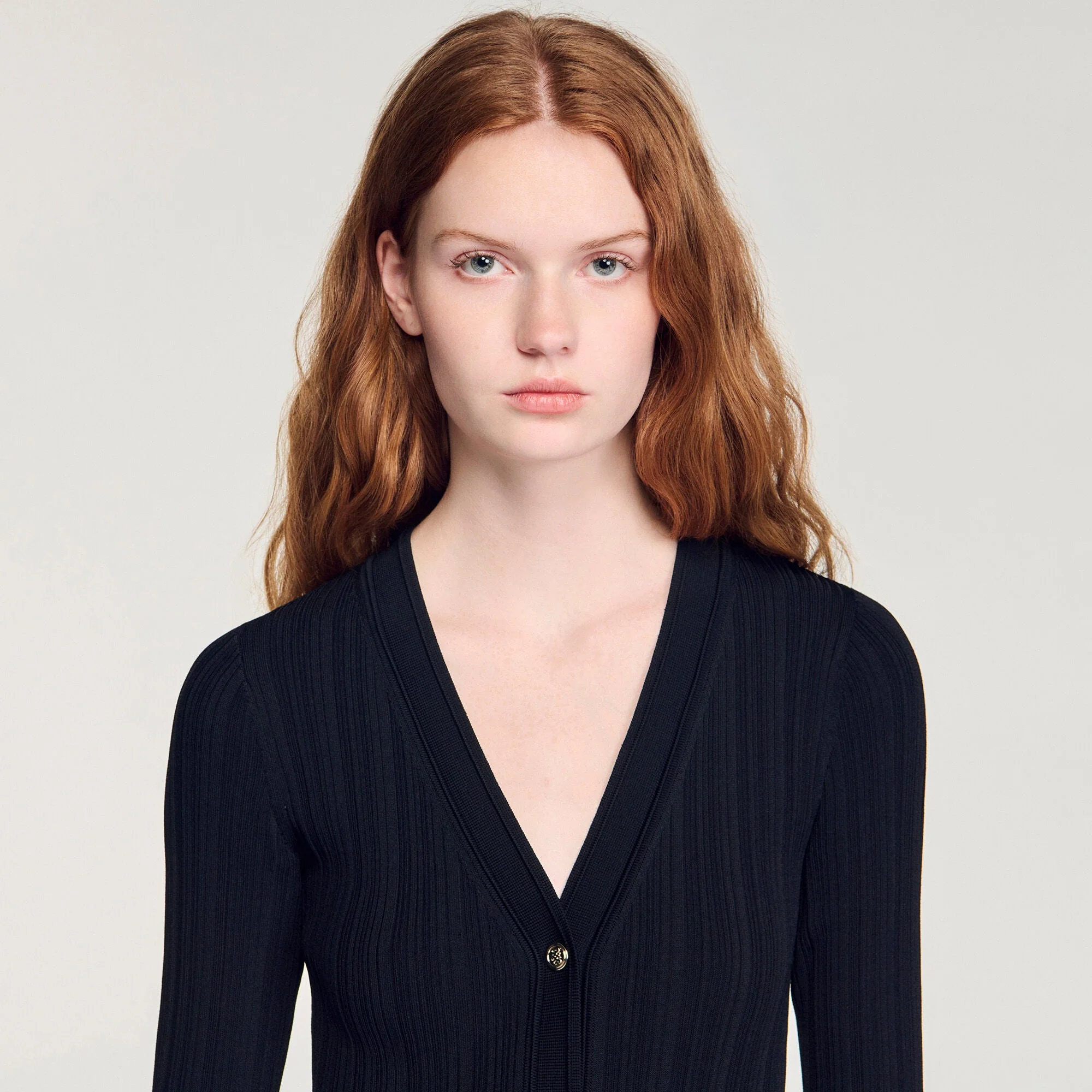 Fitted maxi dress in a plain knit, with a V-neck and long sleeves with wide, flounced cuffs.